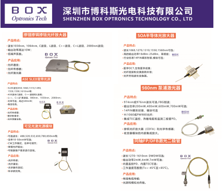 Напівпровідникові оптичні підсилювачі SOA: вибір довжин хвиль 1060, 1270, 1310, 1550, 1560 нм, вихідна потужність 10 дБм-25 дБм, високий коефіцієнт посилення, низький коефіцієнт шуму, підходить для медичної ОКТ, біомедичної візуалізації, волоконно-оптичних з’єднань і компенсації втрат при перемиканні, оптичних перемикачів і перетворювачів довжини хвилі.